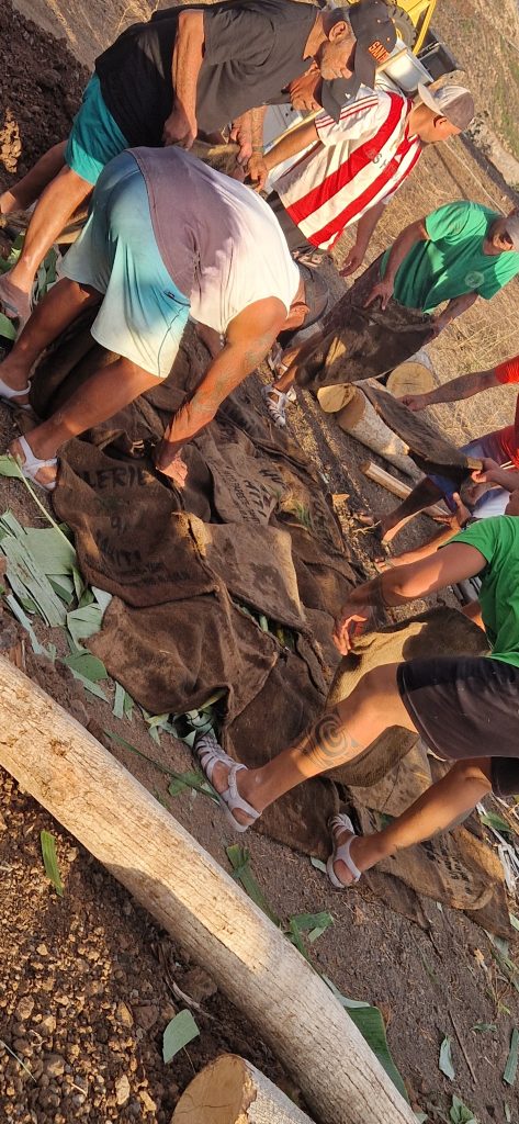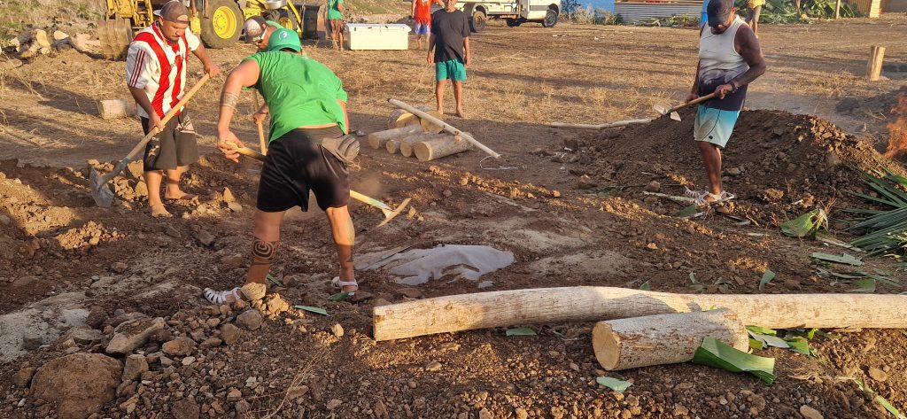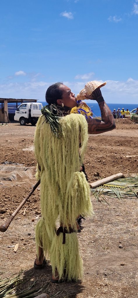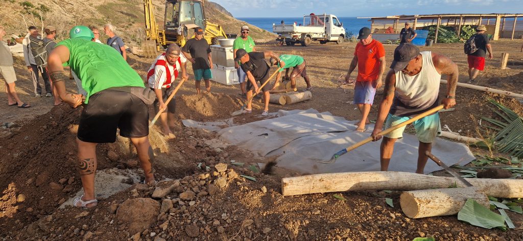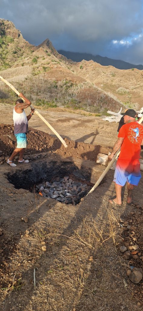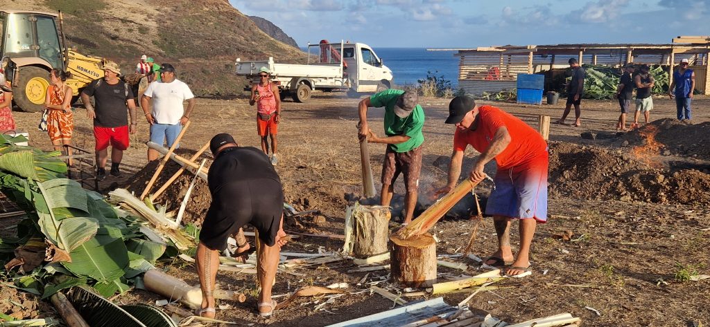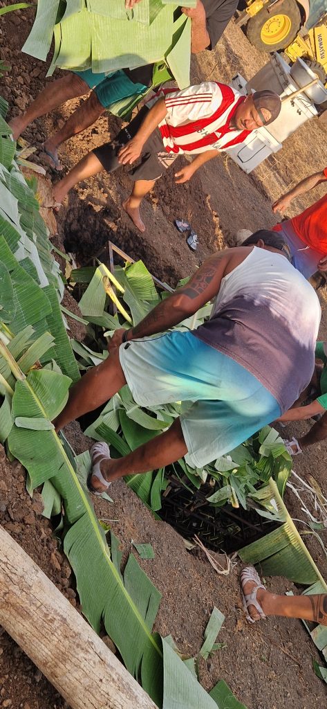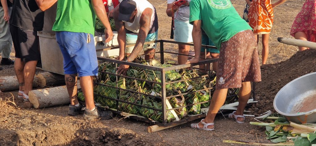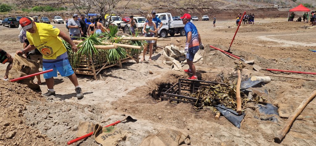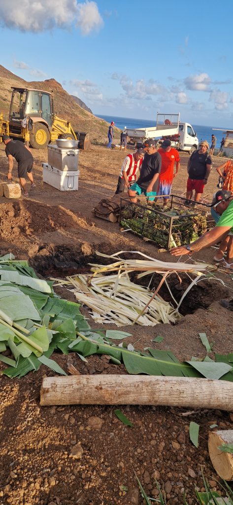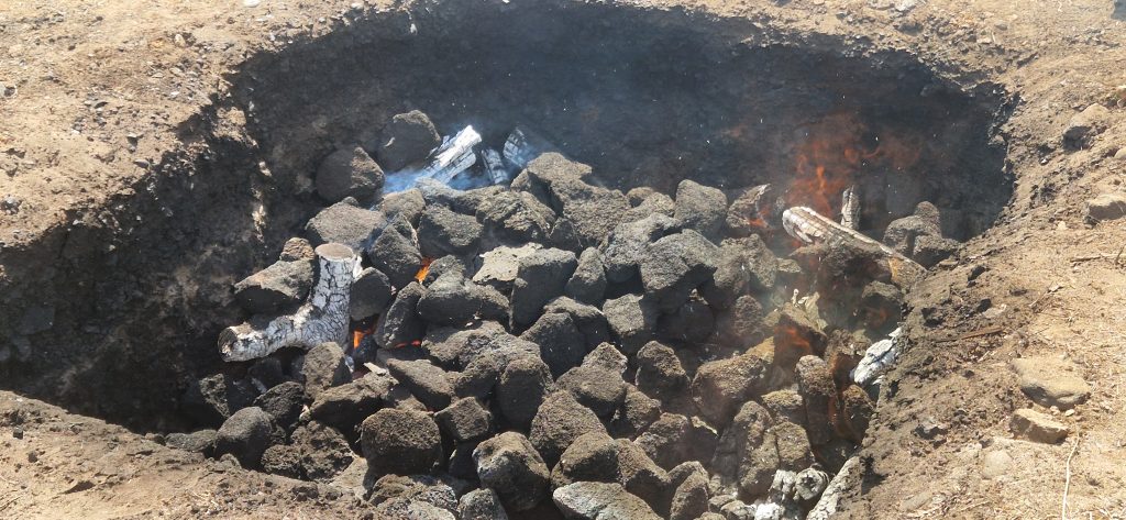 Während dieses Festivals wird auch der traditionelle Erdofen betrieben. So wurde früher (und teilweise auch heute noch) für größere Anlässe gekocht. Hierzu wird ein Loch ausgehoben, ein Feuer darin geschürt und Lavasteine obenauf gelegt, die dann die Hitze speichern. Wenn das Feuer soweit heruntergebrannt ist, werden auf die Steine frische Bananenblätter und aufgespaltene Stauden (die viel Wasser beinhalten!) gelegt und darauf dann das in Palmblätter eingewickelte oder in Taschen gepacktes Essen aufgelegt. Das Ganze dann wieder mit Bananenblätter abdecken und mit feuchten Säcken und Folie abdecken. Letztendlich wird noch alles mit Erde abgedeckt. Dieser Ofen wird am Abend angelegt und gefüllt und dann am nächsten Mittag wieder aufgemacht. Hier auf dem Festival wird dann das so gegarte Essen an alle verteilt. Hierzu wurde uns mitgeteilt, daß wir unser „Geschirr“ mitbringen müssen, das dürfe aber kein Plastik sein, sondern sollte aus Kokosschalen bestehen. Und wir sollten vorzugsweise je 2 Kokosnüsse für jeden haben, damit auch etwas reinpasst.