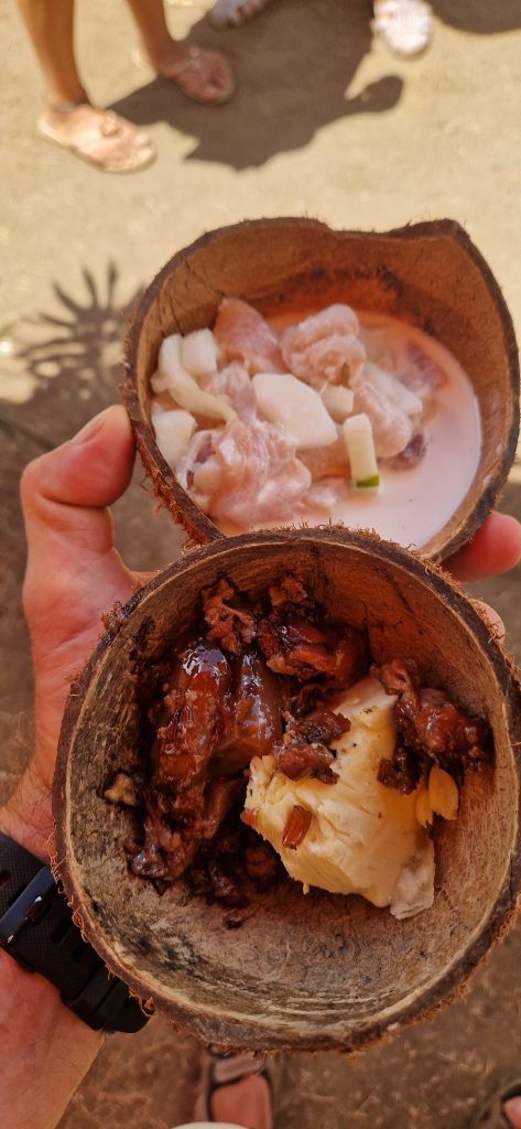 Also war ein To-Do für Ua Huka: in den Wald gehen und Geschirr herstellen. So sind wir dann mit kleiner Axt und Machete in den Wald gezogen, haben uns ein paar schöne große Kokosnüsse ausgesucht die hier ja überall rumliegen. Jochen hat diese dann mit der Axt in mühsamer Arbeit aufgespalten und geschält, die schwierigste Aufgabe dabei. Die innenliegende Nuss dann mit der Machetenrückseite „anklopfen“, so daß diese rundherum springt. Das Kokoswasser dann getrunken bzw. ablaufen lassen, war dann doch zuviel für mich und das Kokosfleisch ausschaben. Zum Schluß die Schale außenrum noch etwas „enthaart“ und etwas ansehnlicher gemacht und fertig ist die Schüssel. Man kann jedoch nur eine Hälfte der Nuss benutzen, da die andere Hälfte ja die Augen für die Triebe hat und daher Löcher. Letztendlich haben wir 6 oder 7 Nüsse bearbeitet, um ein paar schöne Schalen zu bekommen. Das Essen kann kommen!!!